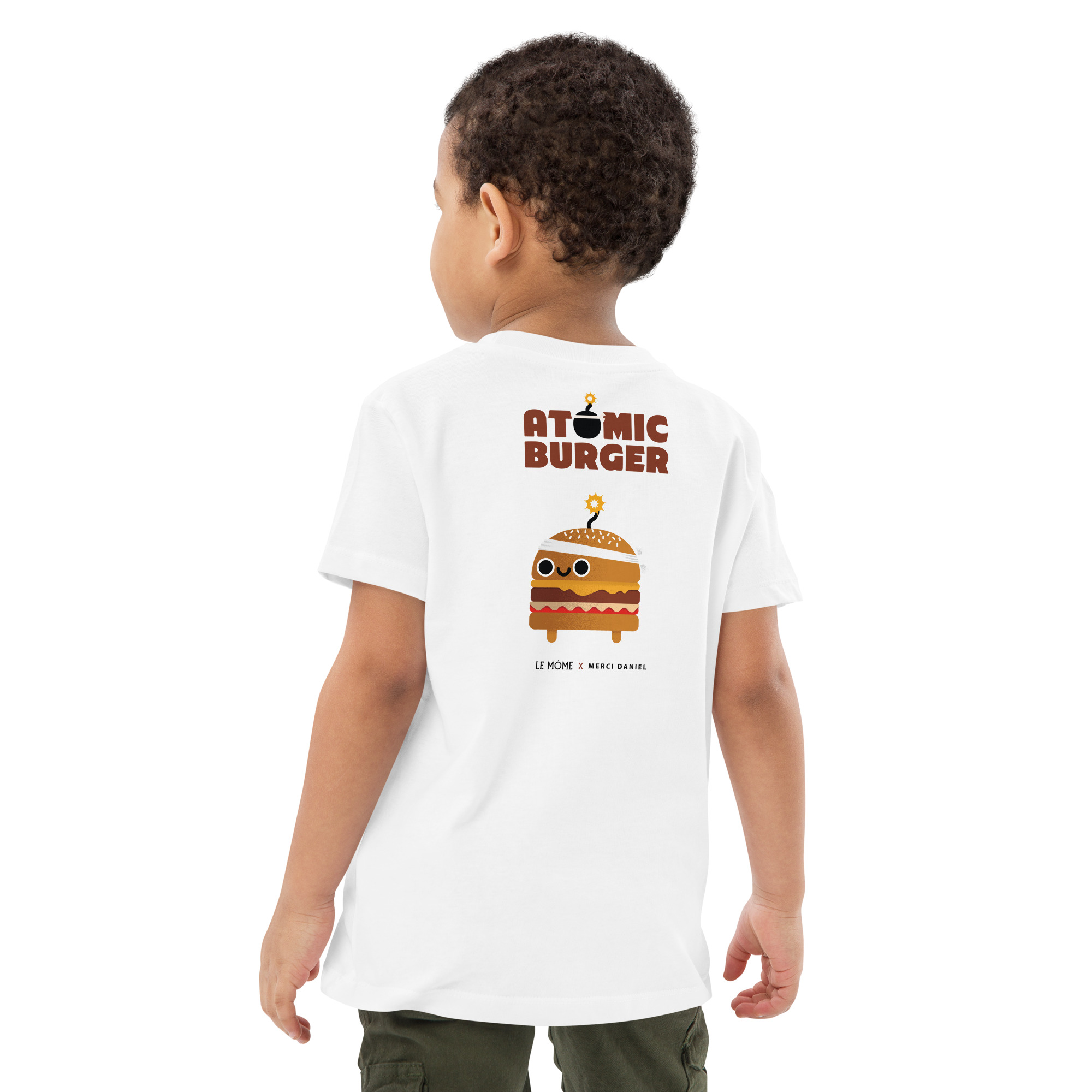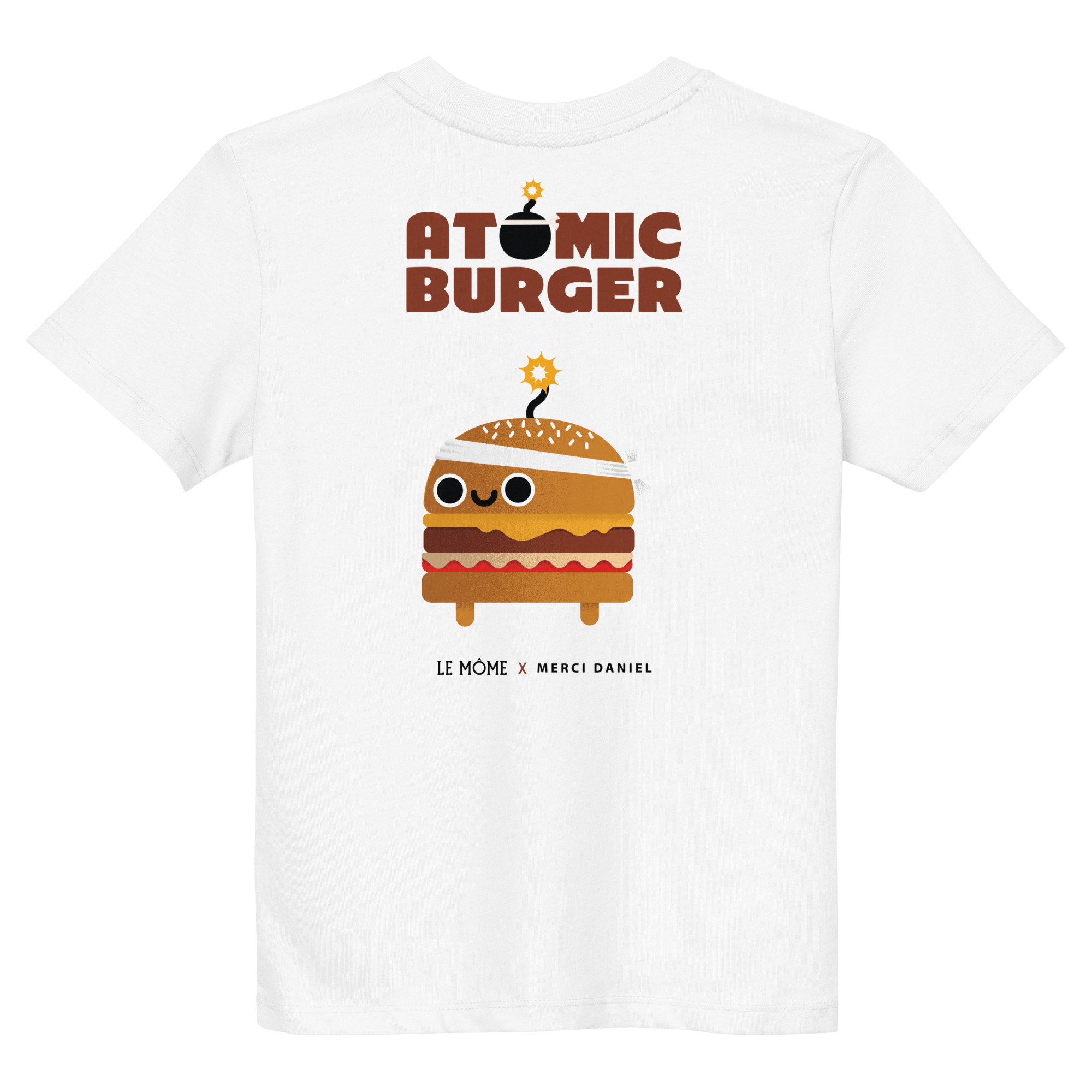 Ce t-shirt est né d’une collab’ qui envoie du lourd entre Le Môme & Merci Daniel. Inspiré de leur plat l’Atomic Burger, on découvre une mascotte prête à faire sauter les papilles !